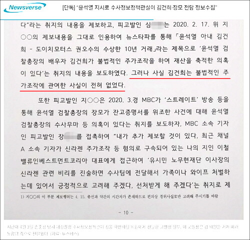 3일 밤 <뉴스버스>는 ‘고발 사주’ 의혹 후속으로 “지난해 4월을 전후해 당시 대검찰청 수사정보정책관실이 윤석열 전 검찰총장의 부인 김건희 씨 사건, 장모 최모 씨 사건, ‘검언유착 의혹’ 사건 보도 경위를 전담해 정보를 수집하고 관련 법리를 만든 것으로 보인다는 증언이 당시 대검 고위간부에게서 나왔다”고 보도했다.