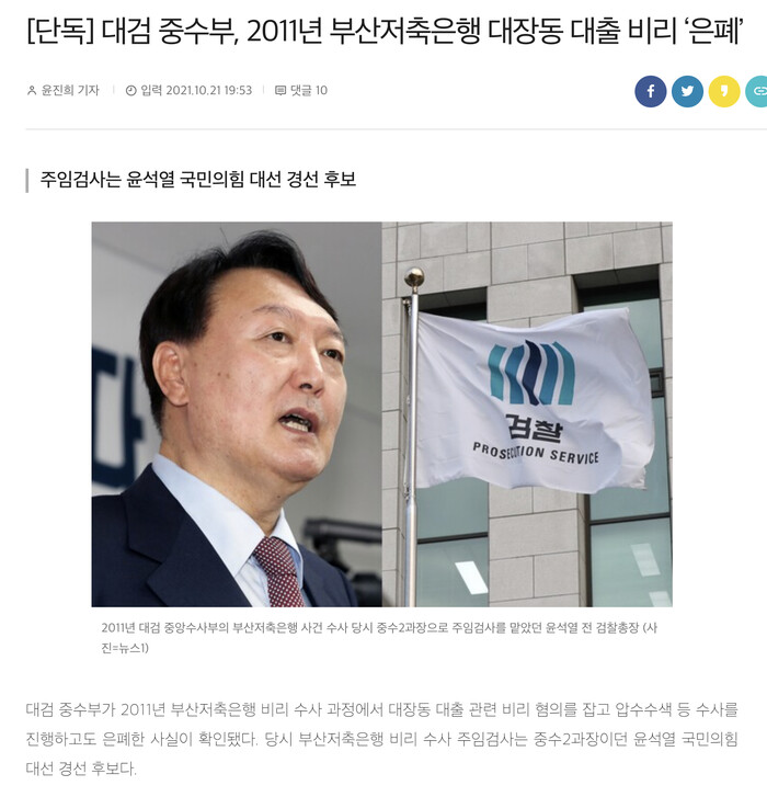 당시 뉴스버스는 대검 중수부가 2011년 부산저축은행 비리 수사 과정에서 대장동 대출 관련 비리 혐의를 잡고 압수수색 등 수사를 하고도 은폐했는데 당시 주임 검사가 중수2과장이던 윤석열 국민의힘 후보라고 보도했다.