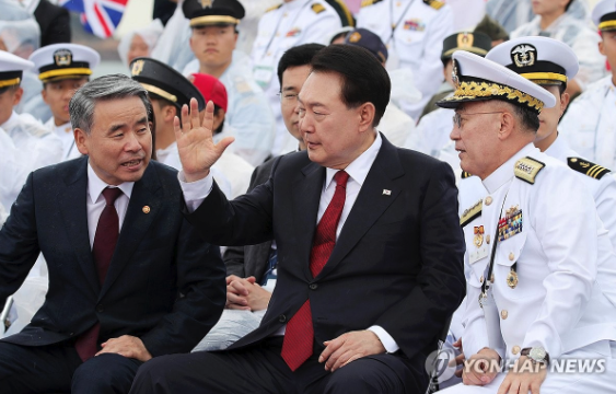 | ▲ 2023년 제73주년 인천상륙작전 전승행사에서 대화나누는 이종섭 전 국방부장관과 윤석열 대통령 |