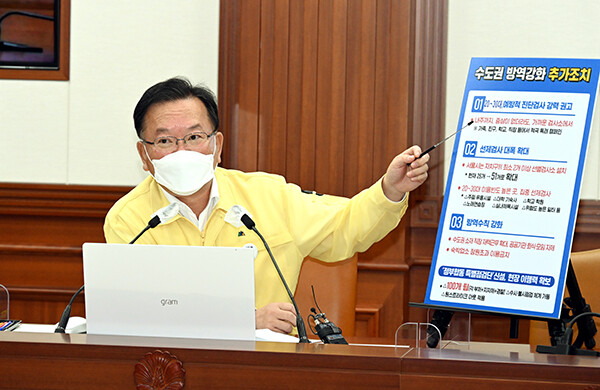 김 총리는 “우선은 발등에 떨어진 불을 꺼야 한다”며 “정부는 수도권의 젊은 층 보호에 초점을 맞춰 추가적인 방역대책을 시행하고 현장의 이행력 확보에 역점을 두어 더 강력하게 대응하겠다”고 밝혔다. 그러면서 “20~30대 분들은 현재 증상이 없더라도 가까운 선별 검사소에서 진단검사를 받아달라”며 “20~30대의 이용 빈도가 높은 곳에서 집중적으로 선제검사를 할 것”이라고 말했다.