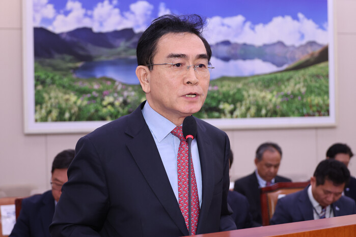 태영호 민주평화통일자문회의 사무처장이 8일 국정감사 현장에서 장남의 사기 혐의에 관해 "물의를 일으켜 송구하다"고 머리를 숙였다.