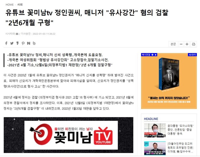 유튜버 "꽂미남TV를 운영하는 정인권 씨"가 (전) 꽂미남TV 스패너 신 모씨를 "성폭행한 혐의" 로 11월 25일 오전 10시에 진행된, 2심 재판에서 "징역 1년 6월 선고 받고 법정 구속" 됐다. "실형 1년 6개월에 성 교육 40시간 봉사, 신상정보공개 명령" 도 받았다. 그리고 도주 우려가 있다는 법원의 판단으로 이 날 법정 구속됐다.