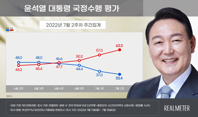 여론조사 전문기관 리얼미터가 미디어트리뷴 의뢰로 7월 11일(월)부터 15일(금)까지 닷새 동안 전국 18세 이상 유권자 54,259명에게 통화를 시도해 최종 2,519명(무선 97 : 유선 3)이 응답을 완료한 2022년 7월 2주차 주간 집계 결과, 윤석열 대통령 취임 10주차 국정 수행 지지도(긍정 평가)가 지난주 7월 1주차 주간집계 대비 3.6%P 낮아진 33.4%(매우 잘함 19.2%, 잘하는 편 14.2%)로 나타났다.