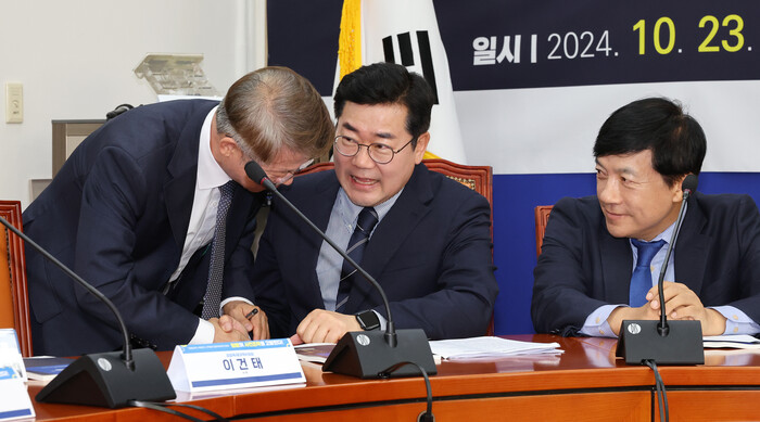 | ▲대화 나누는 민형배, 박찬대, 이성윤 의원 (사진=연합뉴스) |