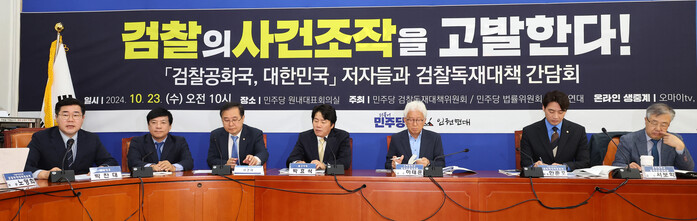 민주당 검찰독재대책위원회는 23일 국회에서 검찰의 과잉·표적 수사를 비판하는 책 '검찰공화국, 대한민국'을 쓴 저자들과 간담회를 열었다.