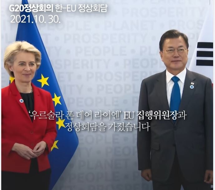 한-EU 정상회담은 지난 6월 G7 정상회의 계기 개최 이후 4개월 만으로, 폰 데어 라이엔 집행위원장은 “지난 영국 G7에서 문 대통령과의 만남이 인상적이었다”며 친근감을 표시했다.