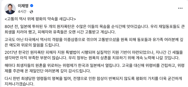 이 대통령은 이날 페이스북을 통해 "고국도 아닌 타국에서 역사의 격랑을 이중삼중으로 겪으며 고통받으셨을 원폭 피해 동포들과 유가족 여러분께 깊은 애도와 위로의 말씀을 드린다"며 말문을 열었다.