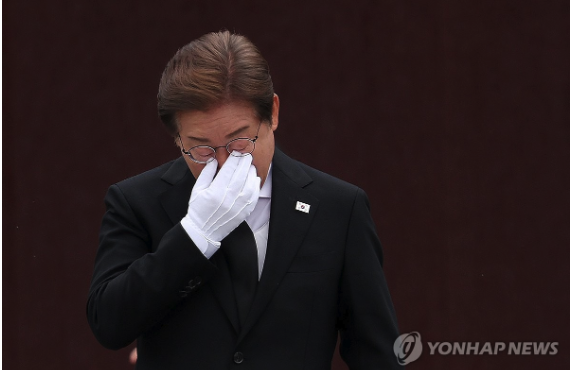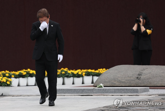 | ▲ 2025.5.23 노무현 전 대통령 16주기. 더불어민주당 이재명 대선 후보가 묘역 참배 및 헌화를 마친 후 눈물을 훔치고 있다. (사진=연합뉴스) |