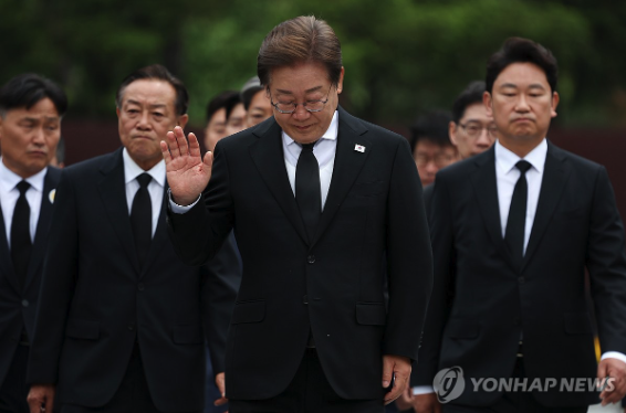 | ▲ 2025.5.23 노무현 전 대통령 16주기. 더불어민주당 이재명 대선 후보가 묘역 참배 및 헌화를 하고 있다. (사진=연합뉴스) |