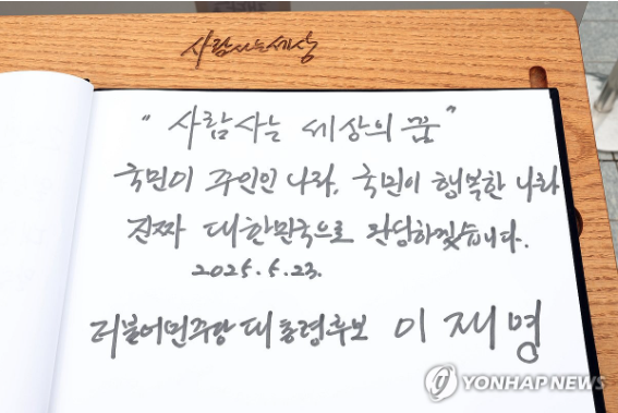 | ▲ 2025.5.23 노무현 전 대통령 16주기. 더불어민주당 이재명 대선 후보의 방명록 (사진=연합뉴스) |