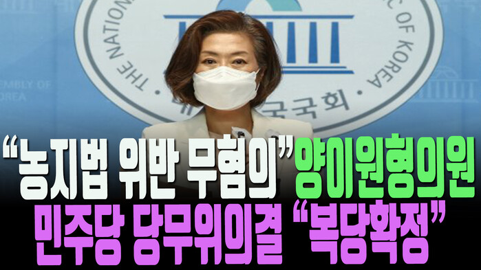 더불어민주당에서 제명됐던 양이원영 무소속의원(비례대표)이 복당 절차가 8일 오늘 완료된다. 당시 모친이 매입한 토지와 관련해 "농지법 위반 의혹" 을 받았으나, 정부합동특별수사본부는 지난달 14일 해당 의혹에 대해 "무혐의 판단" 했다.