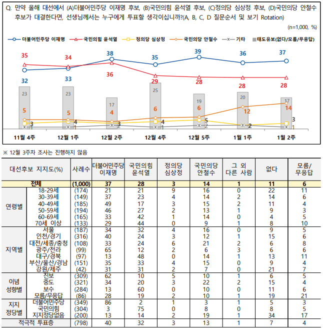 ▶ 이재명 37%, 윤석열 28%, 안철수 14%, 심상정 3%, 태도유보 17%