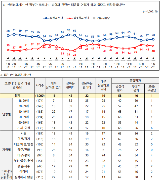 ▶️정부코로나19 방역대응평가 – 긍정적 평가 58% > 부정적 평가 40%
