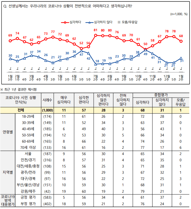 코로나19에 대한 시민들의 상황 인식▶ 심각하다 68% > 심각하지 않다 31%