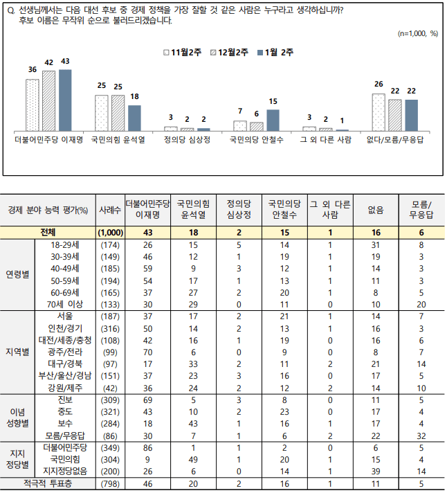 -경제분야능력평가;이재명43%,윤석열18%,안철수15%,심상정2%