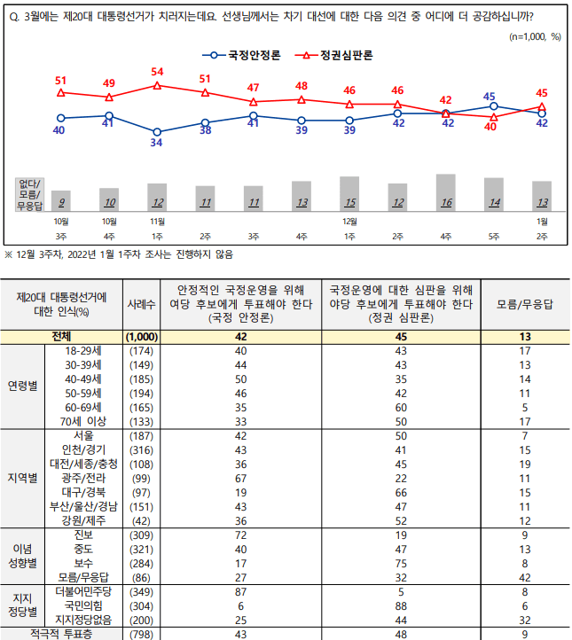 ▶️대통령선거 인식: 국정 안정론 42%, 정권 심판론 45%