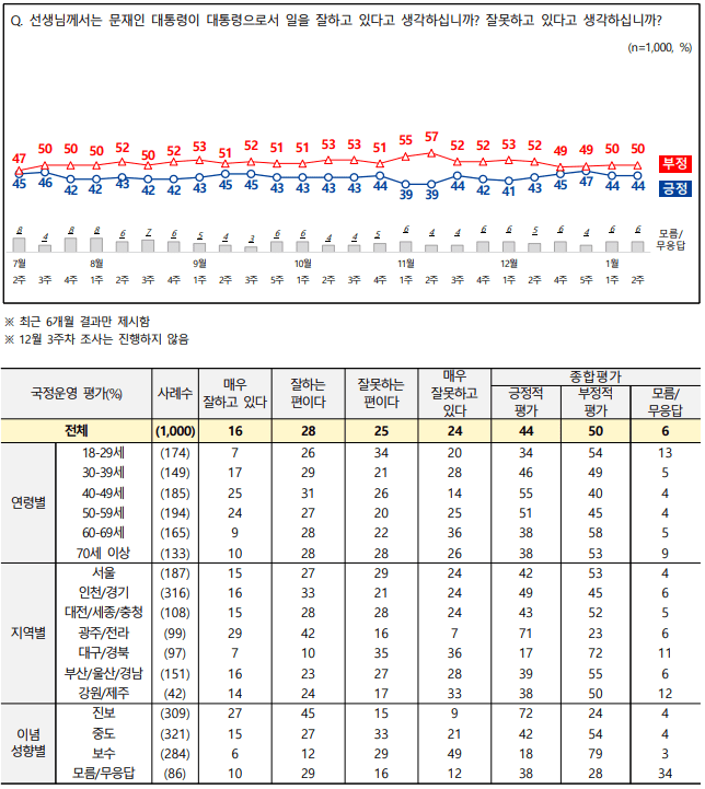 ▶대통령국정운영평가;긍정적 평가 44%, 부정적 평가 50%