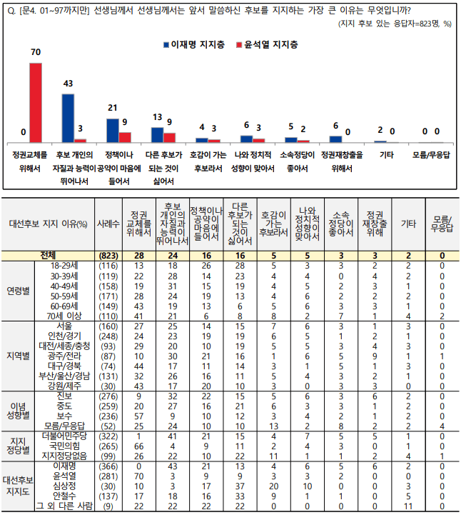 ▶ 이재명: 후보 개인의 자질과 능력(43%), 윤석열: 정권교체 위해(70%)