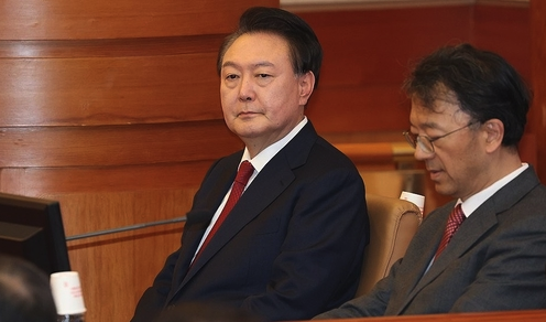 윤석열은 방청석 기준 심판정의 우측에 앉아 말없이 정면을 응시하거나 방청석을 쳐다보면서 재판이 시작되기를 기다렸다.