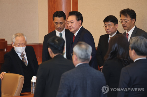 윤석열이 들어오자 심판정 안에서 기다리던 대리인들이 일어나서 대통령을 맞이했다.