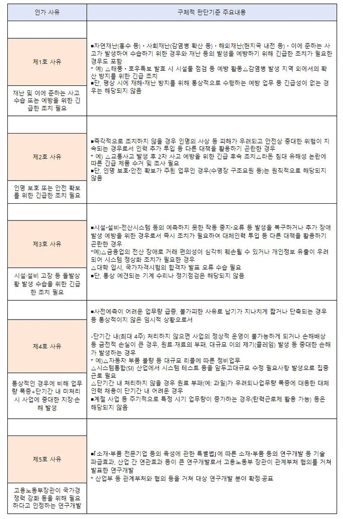 (근로기준법 시행규칙 제9조제1항) ①재해.재난 수습.예방, ②인명보호.안전확보, ③돌발상황, ④업무량 폭증, ⑤국가경쟁력 강화를 위한 연구개발 등