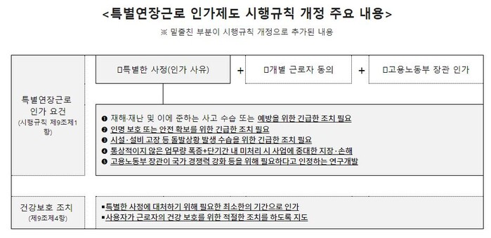 | ▲ 특별연장근로 인가제도 개정 주요내용, 밑줄친 부분이 개정추가내용 (잡아봐) |