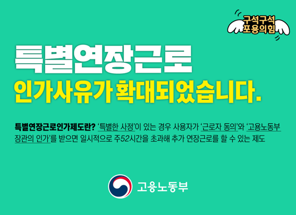고용노동부는 최근 코로나19 확진자가 급증하는 상황과 관련하여, 직원 일부가 감염병 확진 등으로 일손이 감소하고 인력 대체가 어려운 경우, "특별연장근로 제도를 활용" 할 수 있다고 밝혔다.