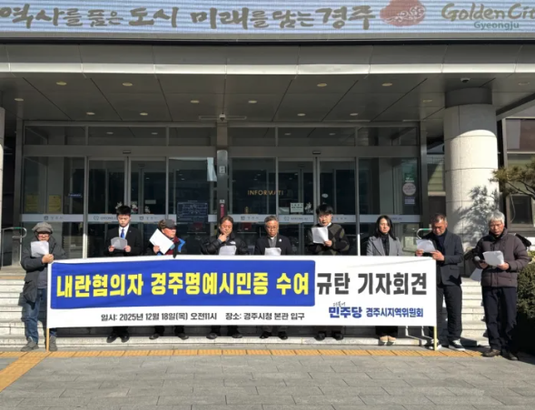 한영태 민주당 경주시지역위원장은 “내란에 동조했거나 혐의를 받는 인사에게까지 명예시민증을 주는 것은 시민의 명예를 훼손하는 일”이라며 “경주시가 역사와 시민 앞에 부끄러운 결정을 했다”고 비판했다.