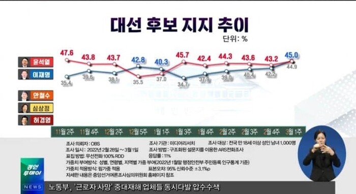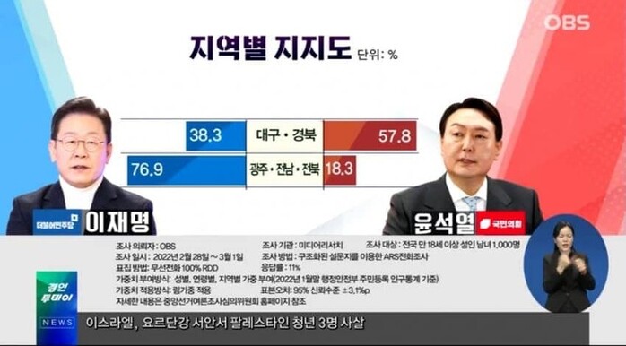 2일 OBS 발표에 따르면 윤석열 국민의힘 대선후보는 44.9%로 나타나 이 후보와 0.1%p 초박빙 접전을 벌이고 있다. 특히 이 후보는 국민의힘 텃밭인 "대구와 경북에서 38.3%를 획득해, 지지율 상승" 을 견인했다.
