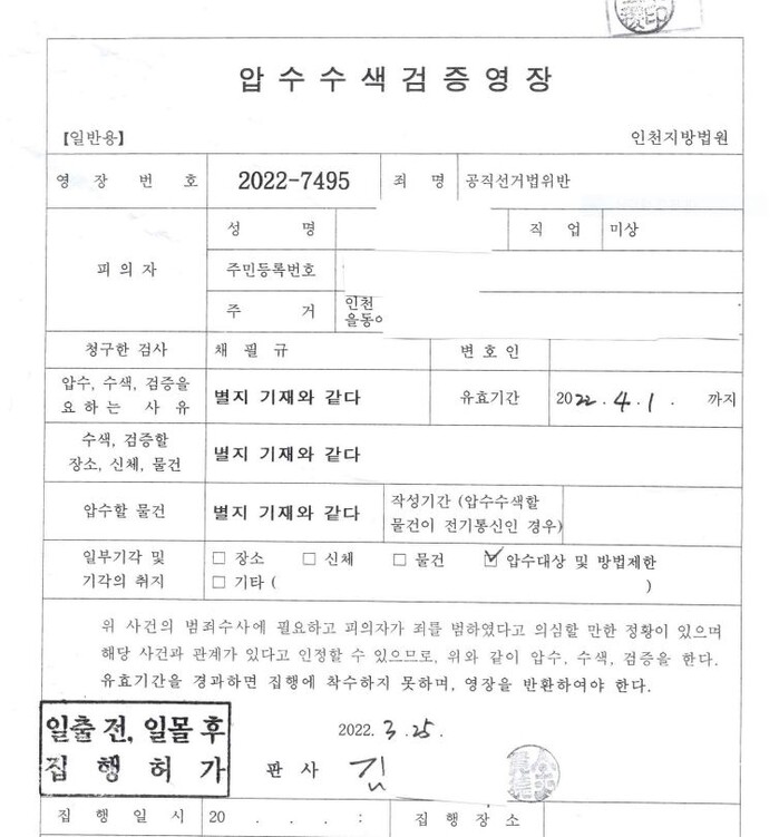 | ▲ 시민 A씨에게 통지된 압수수색검증 영장 |