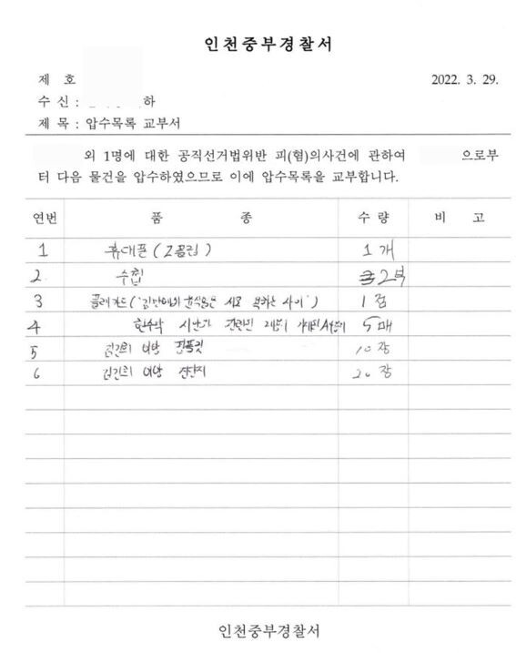 | ▲ 시민 A씨에게 발부된 압수수색 목록표 - 압수수색 목록표를 제공해야 한다는 법을 더불어민주당 이수진 의원이 발의했다. 압수수색 대상자는, 위 목록표에 없는 것에 대하여 거부 할 권리를 분명하게 한 법이다. |