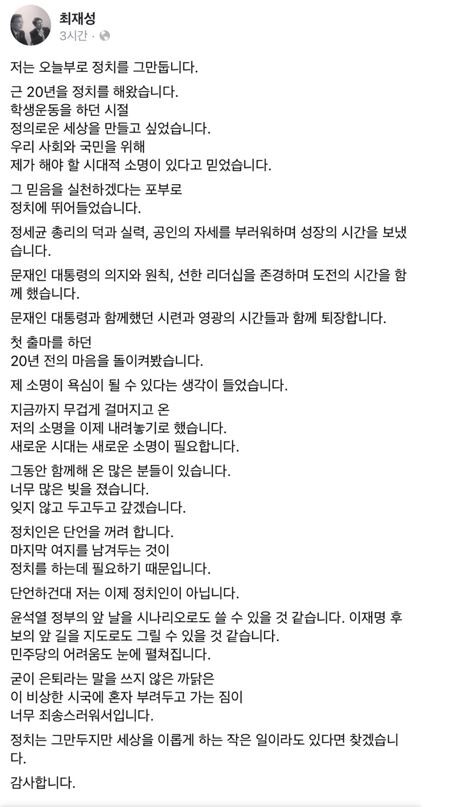 더불어민주당 최재성 의원이, 페이스북에 '퇴장의 변'을 남겼다.