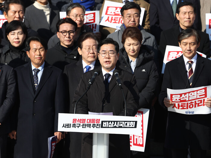 | ▲ 4일, 윤석열 대통령 사퇴촉구 탄핵추진 비상시국대회에서 규탄사하는 박찬대 원내대표 (사진=연합뉴스) |