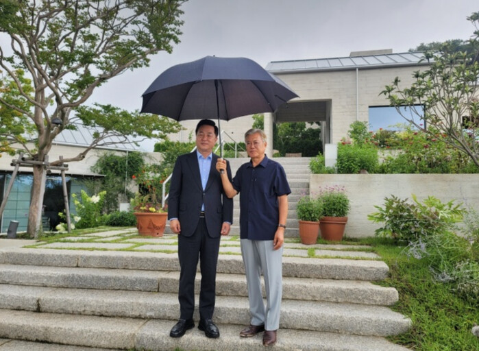 문재인 전 대통령은 양산 평산마을을 방문한 김두관 더불어민주당 당대표 후보에게 "용기 있는 결단"이라며 “이재명 후보와 선의의 경쟁을 통해 의미 있는 성과를 내주면 좋겠다”고 당부했다.