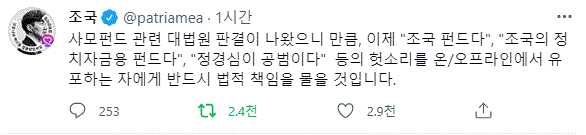 조국 전 장관은 사모펀드 관련 대법원 판결이 나왔으니 만큼, 이제 "조국 펀드다", "조국의 정치자금용 펀드다", "정경심이 공범이다" 등의 헛소리를 온/오프라인에서 유포하는 자에게 반드시 법적 책임을 물을 것입니다. 라고 했다.