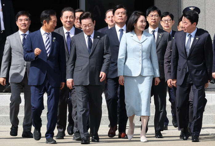 | ▲ 유엔총회 참석차 출국하는 이재명 대통령과 김혜경 여사가 22일 성남 서울공항에서 환송인사들과 함께 공군 1호기로 향하고 있다. 2025.9.22 (사진=연합뉴스) |