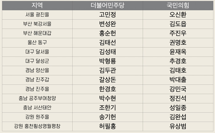 한편, 18일 오후 현재 대진표가 짜여진 13곳은 다음과 같다.