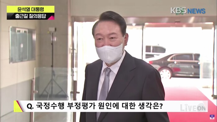 19일 오전 용산 청사에서 진행된 기자와의 질의응답에서 尹은 “부정평가에 대한 원인이 무엇이라고 생각하는가?”에 대한 기자의 질문에 “언론이 더 잘 알지 않냐?”며 불편한 기색을 내비쳤다. 그는 국정수행 부정 평가가 높은 원인에 대해 "그 원인을 잘 알면 어느 정부나 잘 해결했을 것"이라고 말했다. 이어 그는 "열심히 노력하는 것뿐이다."라고 짧게 의견을 비친 후 자리를 떴다.