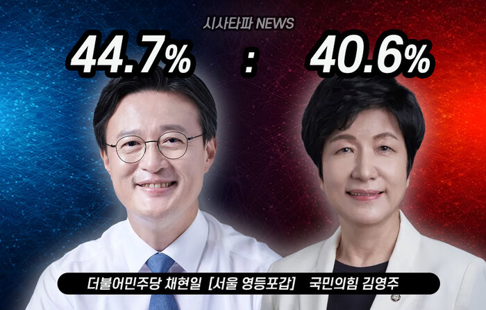 2일 발표된 CBS와 KSOI의 서울 영등포갑 여론조사결과는 채현일 더불어민주당 후보가 44.7%, 김영주 국민의힘 후보가 40.6%, 허은아 개혁신당 후보가 7.0%로 나타났다.
