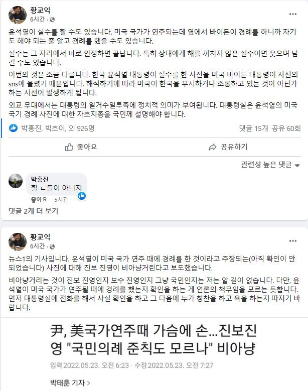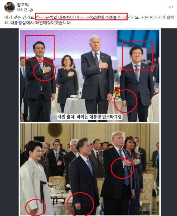 맛칼럼니스트 황교익씨가 23일 자신의 페이스북에, 윤석열 바이든의 미국 국기에 대한 맹세 사진을 올린 후, 윤석열 대통령실에, 미국의 국가가 연주 될 때 윤석열이 가슴에 손을 얹었는지 확인해달라는 요청글을 올렸다.