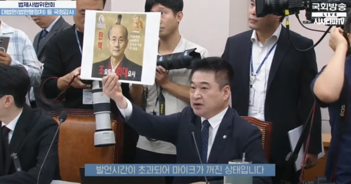 이날 오전 서울 여의도 국회에서 열린 법사위 국감에서 무소속 최혁진 의원은 “친일 사법의 상징”이라며 일본식 상투를 튼 조 대법원장 합성 이미지를 들어 보였다. 그는 “윤석열 정부가 친일 보수 네트워크를 통해 조 대법원장을 낙점했다”며 “이승만·박정희를 공로자로 언급한 조 대법원장은 왜곡된 역사관을 가졌다”고 주장했다.