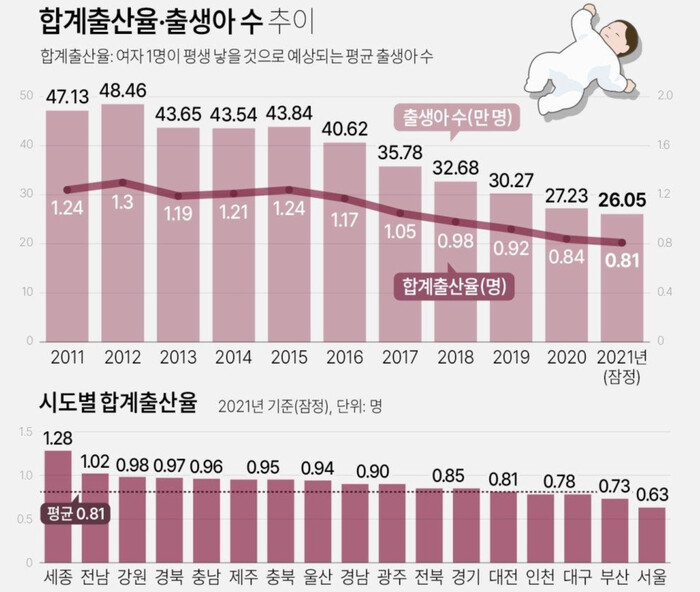 | ▲합겨출산율과 출생아 수 추이 (자료=통계청, 그래픽=연합뉴스) |