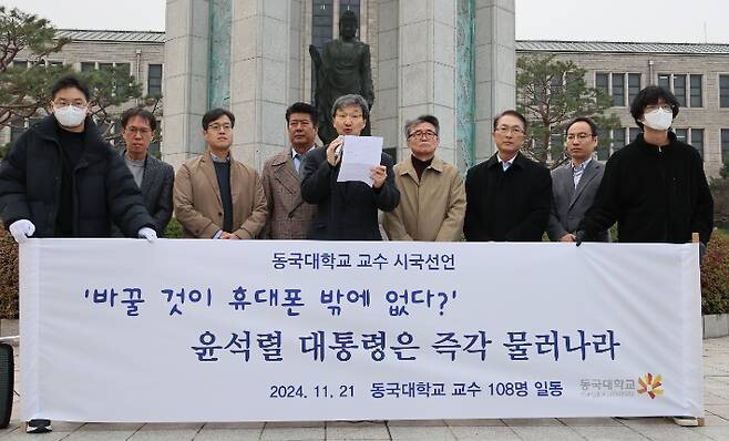 동국대 교수 108명은 이날 오전 서울 중구 동국대 서울캠퍼스에서 시국선언 회견을 열고 “윤 대통령은 즉각 하야하길 바란다”고 밝혔다.