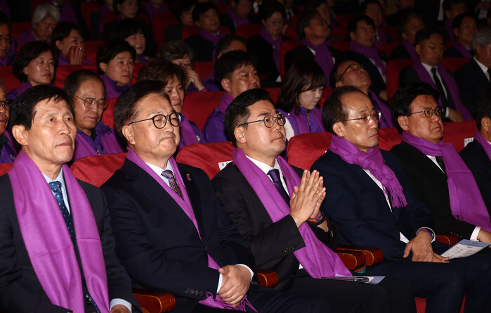 여야 지도부를 비롯해 보라색 목도리를 두른 참석자들은 희생자들의 영정에 분향·헌화했다.