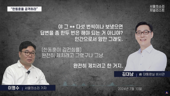 관련된 통화 과정에서 '문자 읽씹' 사건을 거론하며 “야 니네가 이번에 그거 잘 기획해서, 서울의소리에서 (한동훈을) 치면 아주 여사가 니네 이명수...야 들어다 놨다 했다고 좋아하겠는데”라고 말한 것이 공개됐다.