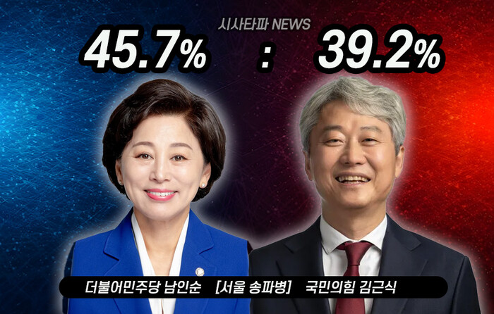 4년만의 재대결로 주목받고 있는 서울 송파병의 여론조사 결과 현역 더불어민주당 남인순 후보에게 투표하겠다는 응답이 45.7%, 국민의힘 김근식 후보를 뽑겠다는 응답이 39.2%로 나타났다.