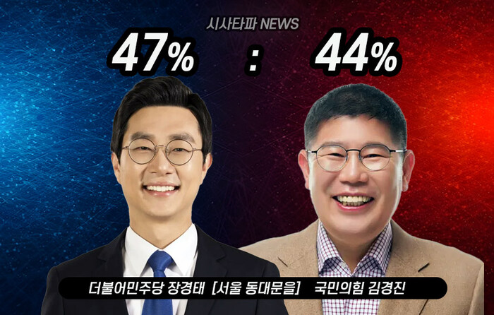 데일리안이 여론조사 전문기관 여론조사공정㈜에 의뢰해 지난달 31일 서울 동대문을 지역구에 출마한 총선 후보들의 지지율을 설문한 결과에 따르면 장경태 민주당 후보가 47.5%, 김경진 국민의힘 후보가 44.0%였다. 두 후보 사이의 격차는 3.5%p로 오차범위 내였다.