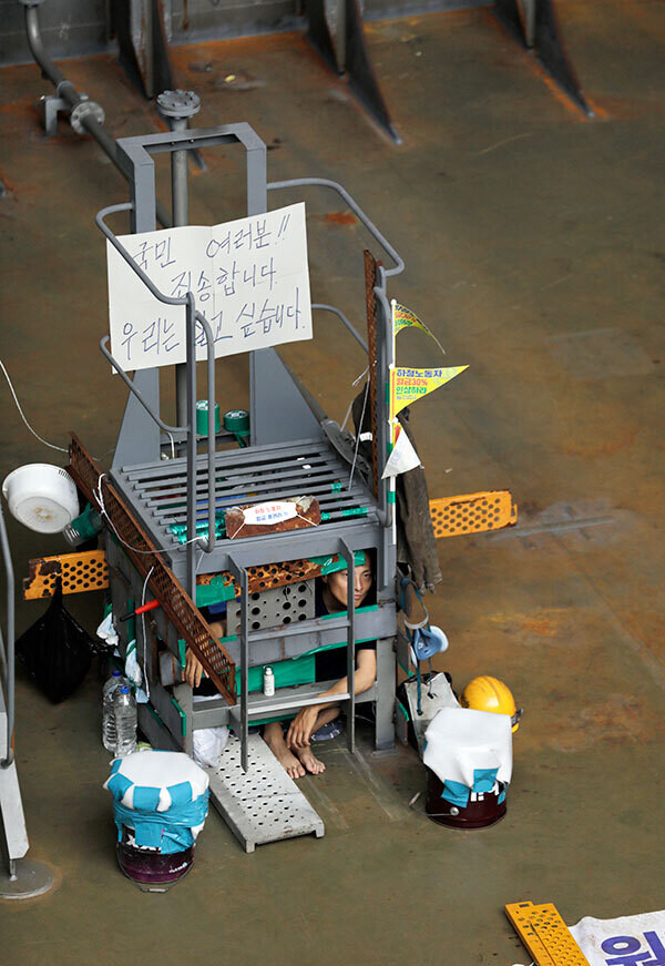 조합원 6명은 조선소 1독(Dock)에 건조 중인 원유운반선 탱크 20m 높이 난간에서, 유최안(40) 부지회장은 탱크 바닥 철판으로 용접된 1㎥짜리 구조물에 스스로 몸을 가둔 상태로 24일째 투쟁하고 있다. 조합원 3명은 지난 14일부터 서울 여의도 산업은행 본점 앞에서 무기한 단식 농성에 들어갔다.