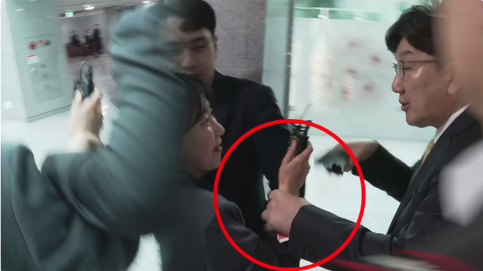 | ▲ 16일 권성동 국민의힘 원내대표가 뉴스타파 기자의 손목을 비튼 채 끌고 가는 모습 (출처=뉴스타파) |