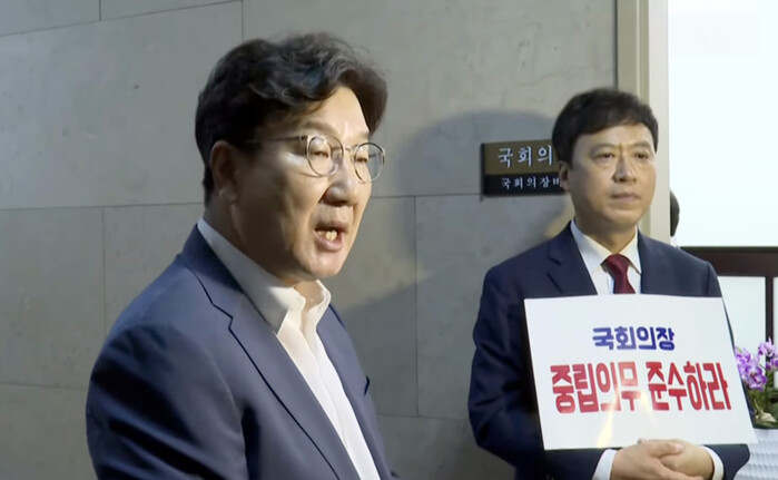 | ▲의장실 앞에서 항의하는 국민의힘 권성동 의원 (사진=연합뉴스) |